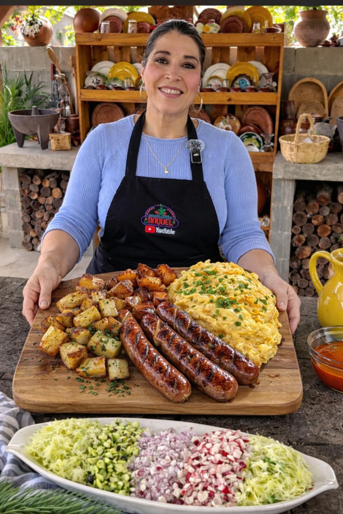Coloca las salchichas en una tabla grande con papas y pasta cremosa. Acompaña con ensalada fresca de col, pepino y rábano con limón.